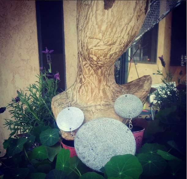 A necklace made from three printings of the famed Aztec Calendar found in Mexico City